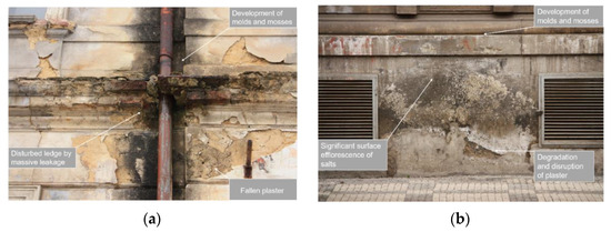 Images clearly showing the most common failures of structures from the second half of the 19th and the early 20th centuries caused by degradation processes initiated in these cases by the combination of moisture, an incorrect design solution and neglected maintenance. The following are clearly visible on images: (a) fallen plaster, damaged ledge by massive leakage, mold and mosses; (b) degradation and disruption of plaster, significant surface efflorescence of salts, mold and mosses.