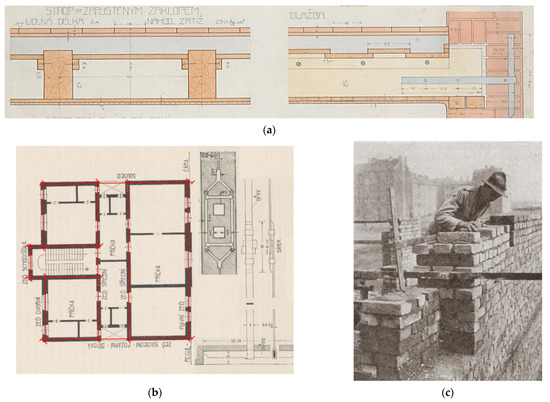 The wall and beam ties: (a) the beam wrought iron ties in the drawing on the school work of V. Vasatko from 1910 [13]; (b) the detail of the wall ties and their location (red lines) in the floor plan of the house [14]; (c) wall ties made of wrought iron, including adjustment with a lock, on a period photograph (1932) when performing a masonry structure [15].