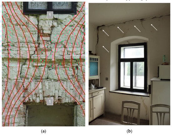 Examples of structural failures of structures from the second half of 19th and the start of the 20th century: (a) prominent tensile cracks in masonry weakened by openings, with the representation of pressure trajectories, 1—area of normal stresses and tensile cracks; (b) crack between the perimeter structure and the ceiling caused by forced deformation due to the effect of a change in the footing bottom.