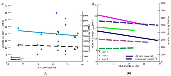 Graphical expression of the dependence of the (a) total porosity and modulus of elasticity and ultimate strength, (b) wt. moisture and modulus elasticity and ultimate strength of bricks from the end of the 19th century [46].