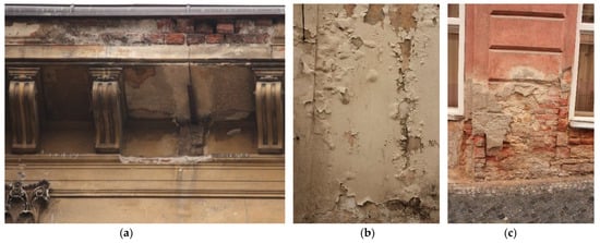 Examples of non-structural failures caused by the effects of the external environment, especially the synergic effect of increased moisture levels and temperature, which are accompanied by chemical, mineralogical and biological processes in structures from the second half of 19th century and the start of 20th century: (a) damage of the ledge and its surface finishes, visible salt efflorescence; (b) closed and open blisters in the surface layers due to their low diffusion permeability; (c) extensive damage to the plinth part caused by the long-term effect of humidity and salts.