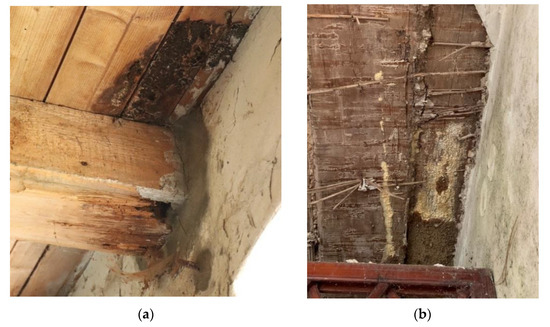 Figure 10. Examples of failures of wooden parts of horizontal load-bearing structures caused by mounting wood without a natural possibility of drying and with insufficient permeability of the structure: (a) rotting head of a wooden ceiling beam; (b) yellow patch of wet rot on ceiling wooden panel.