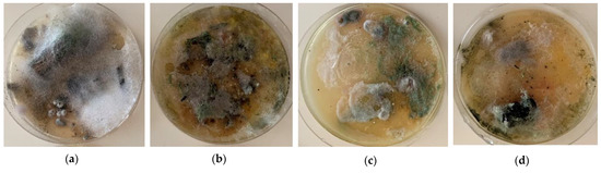Figure 11. Example of laboratory evaluation of bioderiogents in cultures of a sample of a damaged ceiling structure in Prague 7—confirmed presence of bacteria and fungi. In all cases, massive development and growth of microscopic fibrous fungi was noted. In cultures of samples were identified: (a) Trichoderma sp. and bacterias; (b) Trichoderma sp., Mucor sp., wood-destroying fungus and bacterias; (c) Mucor sp. and wood-destroying fungus; (d) Penicillium sp., Acremonium sp., Aspergillus sp. and bacterias [52]. - loosening of joints due to the natural aging and deterioration of major wood properties (water absorption, natural impregnation, elasticity, hardness, strength, toughness),