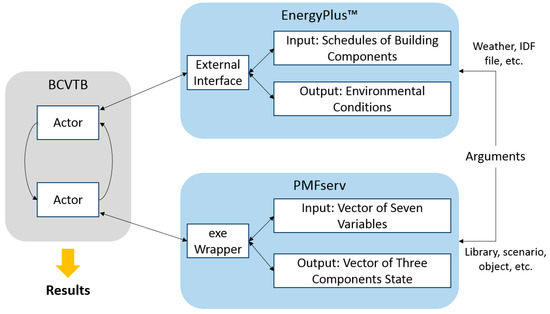 Finally, PMFserv must be configured to be called by BCVTB. An executable application was developed based on the prototype model and simulation scenario created in the graphical interface of PMFserv. To comply with the input/output format with EnergyPlus™, the application was configured to receive the environment and occupancy data from EnergyPlus™ and feed the values to corresponding parameters in the “Built_Environment” object in PMFserv (