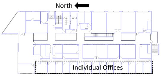 Figure 1) as an experimental test bed to increase the practicality of the research. The case study building has three stories which is comprised of offices, classrooms, laboratories, and some student facilities. The building is supported with steel and the envelope is covered by composite wall panels of aluminum which enclose exterior insulation and finish systems. The exterior glazing (including windows, skylights, and external doors) adopts dual low–emissivity vertical glazing technology for improved daylight utilization. The building has a central HVAC system that contains two air–handling units (AHU) to serve 54 thermal zones from variable air volume (VAV) boxes. A thermal zone usually covers several individual office rooms residing next to each other. The faculty offices are located on the west side of the third floor along a corridor (