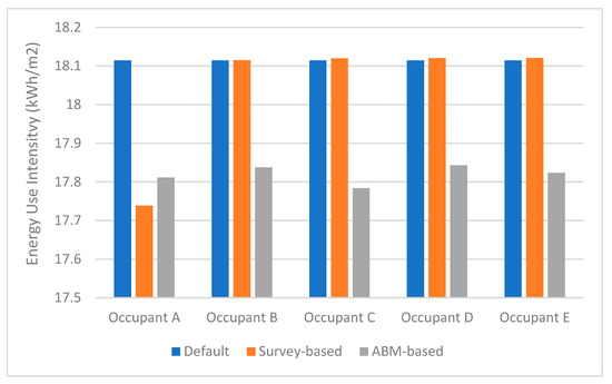2 per month) comparison for the simulation period among five occupants’ behaviors, respectively. It can be seen that an individual’s behaviors can cause whole building energy use variation differently. Since the simulation period is restricted to approximately a month, the absolute difference for an annual energy consumption may be proportionately greater. Moreover, even though the adjustment of windows, doors, and blinds are not direct energy–consuming behaviors, their impact on total energy use are still observable, especially for the ABM–based scenario. Specifically, for the survey–based scenario, all the occupants caused a slight increase in the total energy use, except for occupant A; for the ABM–based scenario, the energy use shows a descending trend when compared to default and survey–based scenarios. Intuitively, the decreased energy use results can be partially explained by the window opening behavior, as natural ventilation would lower the overall energy use with the mitigated use of mechanically conditioned air. This was in fact reflected in the actual (occupant A) and simulated behavior results, where operations on the window occurred alternatively over the simulation period. However, it is also possible that the outdoor air will increase the HVAC load for maintaining the set point, which may compensate for the ventilation effect. Hence, more case studies should be conducted to explore the causality of changes in energy use and specific occupant behaviors. In addition, the reduced EUI under the ABM–based scenario indicates that energy saving could be achieved if adequate energy–efficient occupant behavior is encouraged.