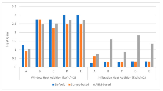 44]. The results show that the survey–based scenario generates similar trends for cooling energy and differences on heating energy. This is because most of the time the outside air was warmer during the simulation period, which can contribute to zone heating. For the total internal latent gain, although a slight deviation is observed, the percentage of difference is subtle. It can be inferred that the behaviors that are not directly consuming energy will only influence the internal gain from people and building equipment a limited amount.
