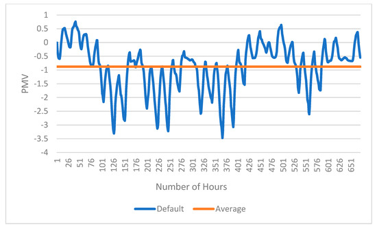45]. Fanger’s equations are used to calculate the mean response of a large group of people for a combination of thermal and metabolic conditions, according to the ASHRAE thermal sensation scale, which is a seven–point scale from −3 (cold) to +3 (hot), with the value of “0” being the neutral sense or the most ideal value. In EnergyPlus™, the PMV information is available to extract in the “People” object. In this study, hourly PMV values were declared for the targeted thermal zones of the building and aggregated for the simulation period.