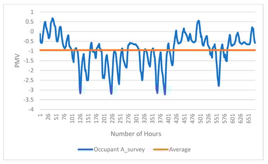 Figure 11 display the PMV trends for occupant A as an example during the simulation period, i.e., 672 h. For all other occupants, the default and survey–based results show a parallel fluctuation with only magnitude differences. For occupant A, although the general trend is similar, obvious differences can be observed over certain time intervals. For example, the extreme value for default scenario almost reached −3.5, while the survey–based scenario tends to have a more moderate value. The average PMV in the survey–based scenario (