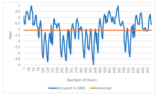 Table 5) is lower because the positive numbers have a generally descending tendency. However, it is noted that a lower positive number indicates a more comfortable “warm” environment, which is the goal of ideal built environment. On the other hand, according to the variance of hourly PMVs for occupant A, the default, survey–based, and ABM–based scenarios achieve the value of 0.763, 0.642, and 1.165, respectively. The survey–based scenario reveals a more stable indoor environment in terms of thermal conditions.