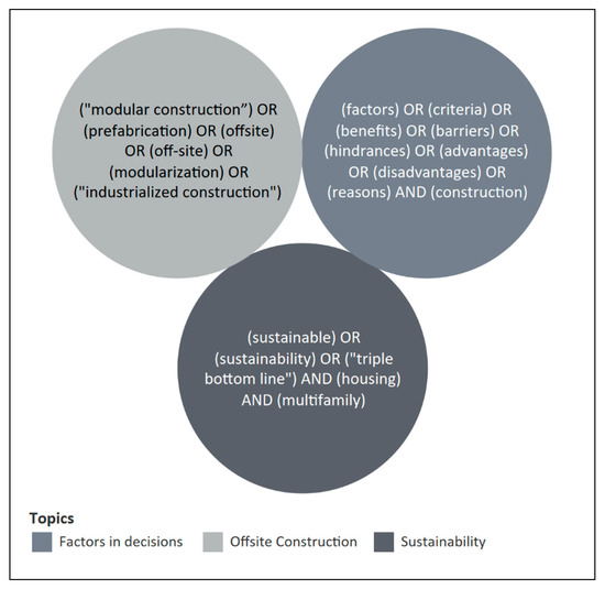 This research consists of a two-phase literature review, followed by a discussion of the results. Phase 1 is based on a systematic review of literature that was published between 2000 and 2019. The literature investigated focused on the advantages and disadvantages, drivers and constraints, and factors that influence the use of OSC in diverse construction sectors from different countries and, more specifically, in multifamily housing, while considering the social, economic, and environmental aspects involved. In order to perform the systematic literature review, the authors defined terms that are associated with offsite construction, multifamily housing, sustainability, and factors affecting decisions, which were used as keywords in data selection and data analysis (Figure 1). Searches were conducted in Engineering Village and Scopus literature databases and complemented by the Google Scholar search engine. In the first round of searches (round 1), only peer-reviewed journal articles in English and addressing all of the three principles of sustainability (environmental, social, and economic) were collected. Articles focusing on heavy civil construction were excluded.