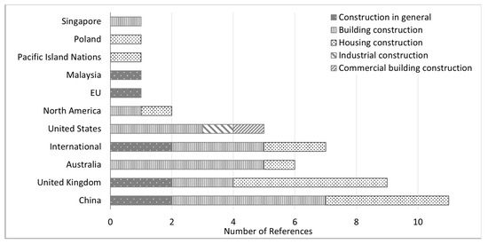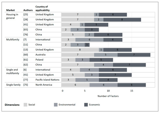 Still focusing on the round 1 literature, a total of 15 out of the 45 investigated articles (33%) focused on the use of OSC in housing construction, but only eight of them addressed the multifamily housing market. Figure 4 presents a summary of the factors that were found in those 15 articles, grouping the articles by market and also considering the country of applicability. Here, again, economic factors were the most frequent, but there is a relative balance between economic (81 references—40%) and social factors (73 references—36%). Regarding environmental factors, they are underrepresented (49 references—24%).