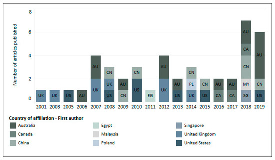 Round 1 literature provided an overview of the factors affecting decisions on the use of OSC in different countries and markets (Figure 2). Almost 50% of the articles focused on the use of OSC in China and United Kingdom. Regarding the number of articles by applicable market and country, only 15 articles (33%) focused on housing construction—none of which specifically focused on the US market. The number of articles published annually has been erratic between 2000 and 2017 (Figure 3). However, approximately 29% of the articles (13 articles) were published between 2018 (seven articles) and 2019 (six articles), with a high number of articles focused on the construction market of Australia (six articles). Appendix A provides more information on the factors identified in each of the 45 articles investigated.