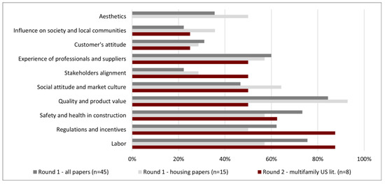 Some differences were noticed when comparing the frequencies of the factors that were identified in round 2 literature (eight documents), round 1 housing papers (15 articles), and all the articles collected in round 1 (45 articles). This suggests that decisions on the use of OSC in building construction involve factors that vary, depending on the specific characteristics of the market (project location) and the type of product (residential, commercial, etc.). However, more research on these differences is needed due to the lower number of articles found that specifically focused on housing (n = 15), and on the American multifamily housing market (n = 8). Following, some of the most noteworthy differences are discussed, according to each sustainability dimension.