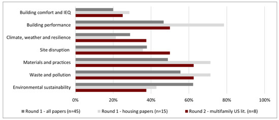 Environmental dimension—comparison of factors from round 1—all papers (n = 45), round 1—housing papers (n = 15), and round 2—multifamily in US literature (n = 8).