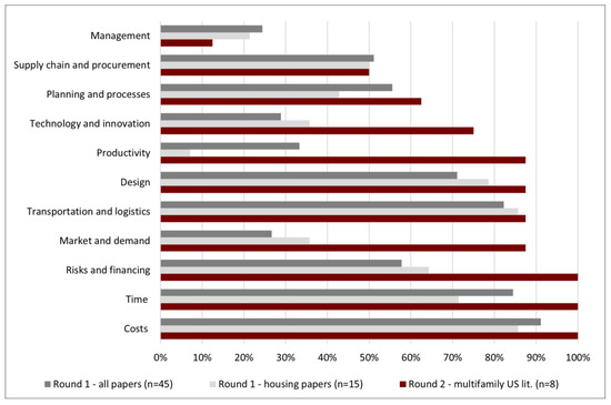 - Risks and financing—much more frequent in the literature that was focused on American multifamily housing (100%) than in both general building construction (58%) and housing construction literature (64%).