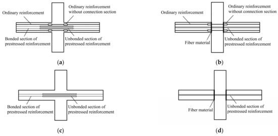 Traditional dry-type structures can be mainly categorized into prestressed splicing joints, welding connection joints and bolt connection joints. In recent years, other new types of dry connections have been proposed in the context of the development of energy-saving industrialized buildings, such as tenon connections, key-way connections and mechanical connections [2]. Among all these dry connection types, prestressed connections are preferred as they are easy to assemble in engineering practice and provide better performance. Since the 1990s, the PRESSS project [3] (a precast seismic structure system project carried out in the United States and Japan) has undertaken special joint tests and finite element analyses for this kind of connection and built the related constructions. The project finally recommended four kinds of prestressed connections, as shown in Figure 1, namely pre-tension with/without damping and post-tension with/without damping.