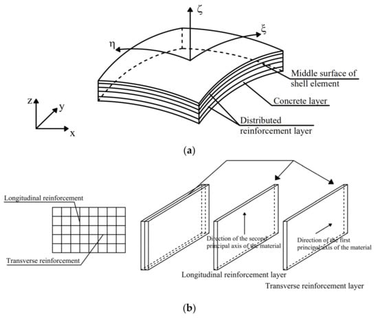 Schematic representation of the layered shell element developed by Lu’s team: (a) Layered shell element; (b) Reinforcement layer distribution.