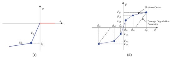 The prestressed rebars were also modeled by the steel02 model but the initial stress should be defined along with the model to reflect the prestressing effect. The ElasticPPGap material model, as shown in Figure 4c, was also used at the beam–column interface to simulate the open–closure effect between the precast elements. For other energy dissipation elements, such as welding, energy-consuming steel bars, energy-consuming steel plates and dampers, the hysteretic material model available in OpenSees can be (and was) selected to simulate the material properties, as shown in Figure 4d.