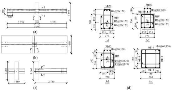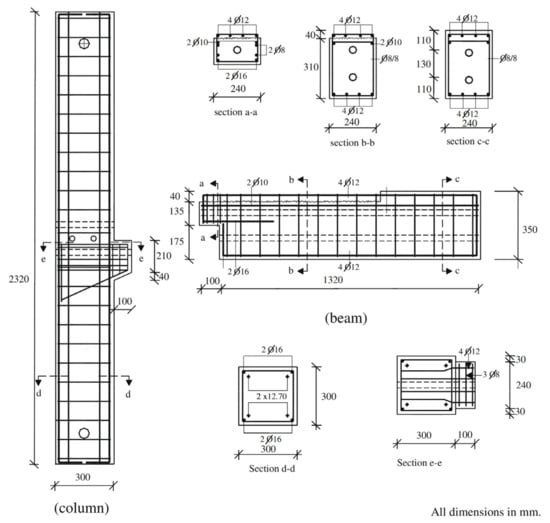 Size and reinforcement of the specimens from [28]: (a) side view of the mid-joint; (b) top view of the mid-joint; (c) side view of the edge-joint; (d) sectional reinforcement (dimensions in mm).