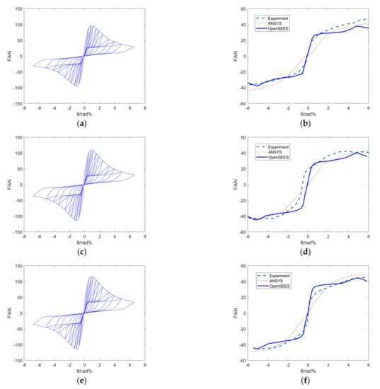 The simulation results of the hysteretic curves for the first three specimens, CP1, AP1 and DP1, are shown in Figure 7. The initial loadbearing capacity of the specimens gradually increased with the initial stress of the prestressed steel bar. The self-centering ability was strong for all three specimens, while the energy dissipation capacity was relatively low and the stiffness degradation was obvious. Kaya et al. [27] also adopted ANSYS to simulate the behavior of specimens and to compare the obtained numerical data with the experimental data. However, the comparisons were limited to the monotonic backbone curve, as it was deemed difficult to model the cyclic responses of the connections using ANSYS. Obviously, the proposed OpenSees-based model had better performance and versatility than ANSYS, as shown in Figure 7b,d,f. More specifically, the proposed model in OpenSees matched the backbone curve much better than the one implemented in ANSYS and could also capture the hysteretic behavior.