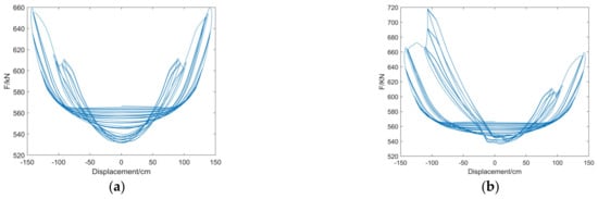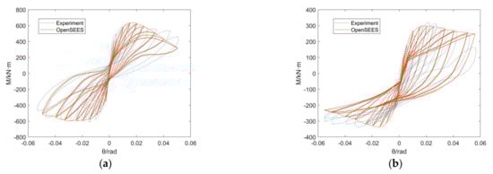 Simulated hysteresis curves of specimens in [28]: (a) simulated hysteresis curve of A2 specimen; (b) simulated hysteresis curve of B2 specimen.