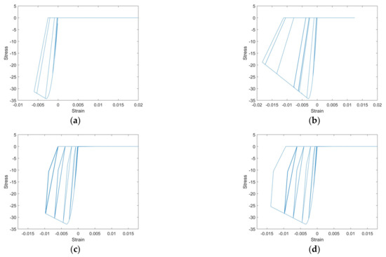 Reinforcing steel was modeled with the steel02 model, as shown in Figure 4b. The model can reflect the Bauschinger effect and its loading–unloading curve is determined by two asymptotic straight lines, the slopes of which are the Young’s modulus Es and the hardening modulus Eh. The shape of the transition section of the loading–unloading curve is controlled by the parameter R, which is expressed by the following equation [26]: