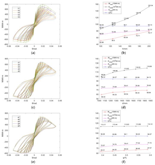 The slab thickness of the A2 specimen (h = 150 mm) was set as the reference value. Four different groups were designed at every 25 mm, h1 = 100 mm, h2 = 125 mm, h3 = 150 mm, h4 = 175 mm and h5 = 200 mm. The loading process of the five specimens was undertaken in the same way as that adopted in [28], with only the first cycle of each drift level simulated. The simulated responses are presented in Figure 11a,b and the key characteristics of the hysteretic curves were also computed for comparative purposes. Four properties were considered, the maximum bending moment Mmax, the initial stiffness Kinitial, the total energy dissipation Etotal and the degradation ratio of secant stiffness ζ. The latter two parameters are expressed as follows: