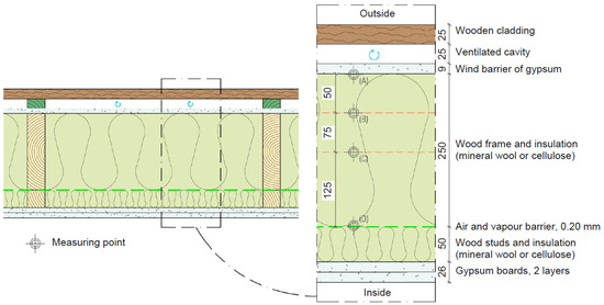 Figure 1 shows a section of the reference wall with the placement of the wind barrier and the air–vapour barrier. From the exterior, the wall is constructed with a 25-mm wooden cladding, 25-mm ventilated cavity, 9-mm wind barrier of gypsum, 250-mm thermal insulation (mineral wool or cellulose) within a wooden stud frame per 600 mm, 0.20-mm air–vapour barrier, 50-mm thermal insulation (mineral wool or cellulose) within wood studs, and 2 × 13 mm gypsum boards. This is a common exterior wood-frame wall structure in Denmark with a thermal transmittance of approx. 0.13 W/m