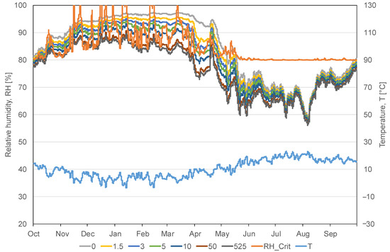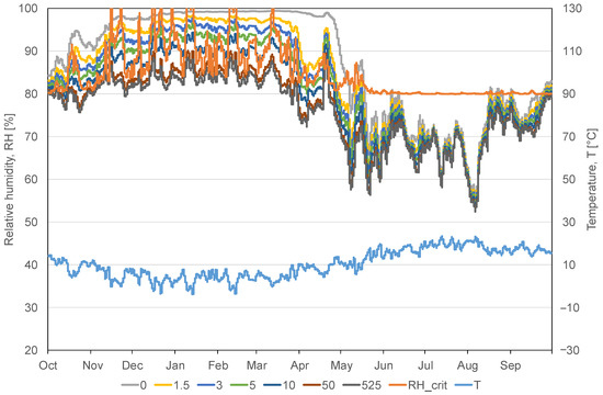 The ventilated cavity was modelled as a 25-mm standard air layer (without additional moisture capacity). The ventilation rate was set constantly to 30 h−1 ventilating with outdoor air.