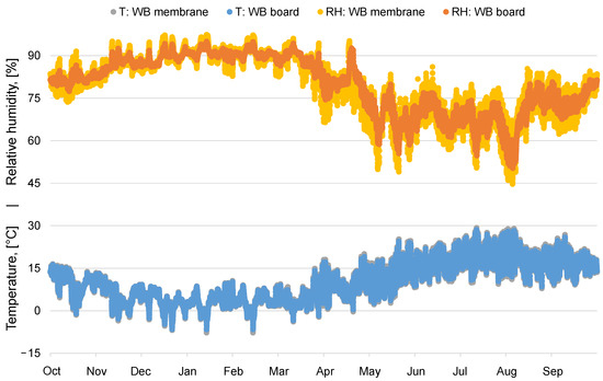 Figure 7 shows the different temperature and relative humidity for both a wind barrier membrane and board material. A comparison of the mould growth index gives MI