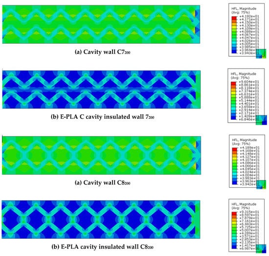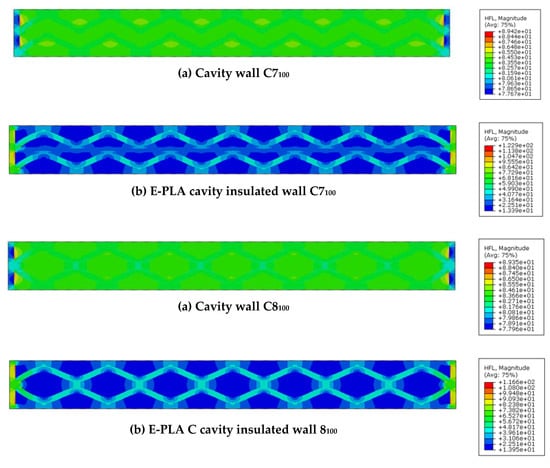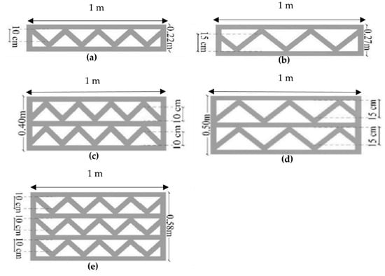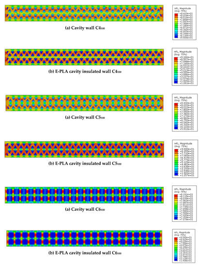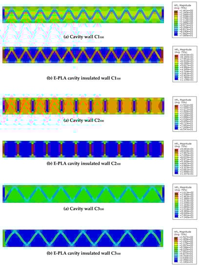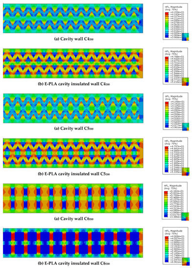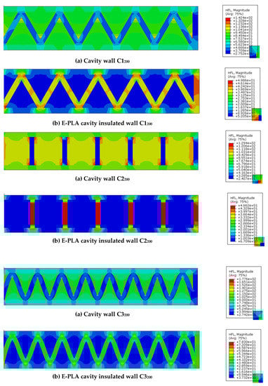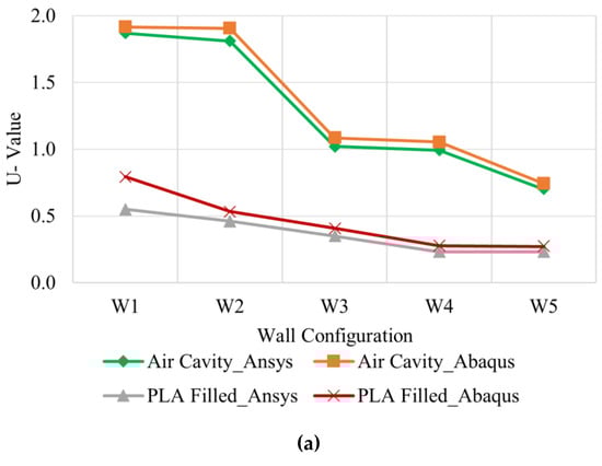 - Triangular-shaped cavity wall panels of 100 mm thickness displayed the highest performance, with lower U-values compared to other configurations. Double-row triangular and sinusoid-shaped 200 mm thickness cavity wall panels showed higher performance compared to other walls. However, the U-values were noticeably higher than the standard values. Thus, expanded polylactic acid (E-PLA) was used as thermal insulation material to enhance the performance;
