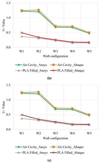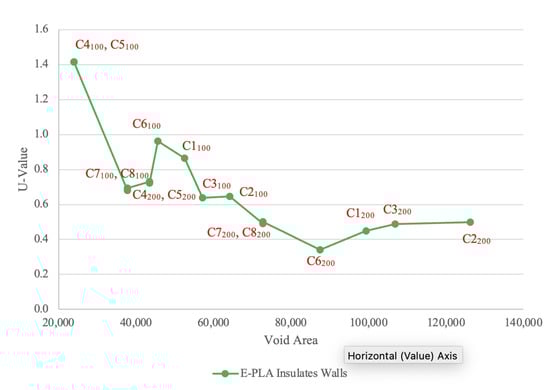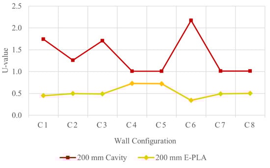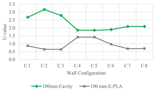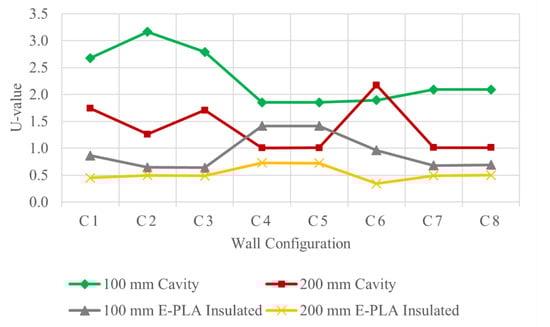 - The incorporation of E-PLA material as the insulation reduced the U-value, and thus increased the thermal performance of the wall panels for all the configurations;