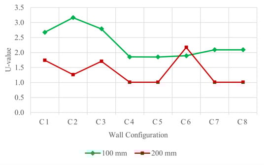 - A significant reduction in the U-value was recognized for 100 mm wall panels with an additional intermediate row compared to single-row panels;