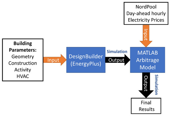 Building simulations are used to estimate hourly electricity loads across a full year. The output results of the building simulations include the building’s electricity consumption on an hourly basis (kWh) while the output of the real-time electricity pricing includes retail hourly electricity prices (GBP/kWh); these data are used as the input of the BSS. The three main elements along with their examined characteristics are summarised below, in Figure 1, while Figure 2 demonstrates the modelling process and the software used along with the key inputs and outputs.