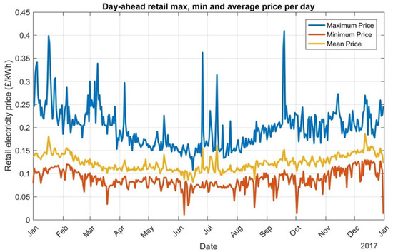 Finally, it must also be taken into account that while the reduced VAT rate of 5% applies for consumption of domestic electricity, non-domestic power is taxed at the standard rate of 20% [57]. The wholesale contribution to the non-domestic electricity price, reported by Ofgem as “direct fuel costs”, was calculated by the current study to be 36.6%, which is around 3% higher than its respective value for domestic electricity [58]. Figure 4 presents the maximum, minimum and average values per day for 2017 for the calculated retail electricity prices. It is shown that the daily difference between the lowest and the highest prices constitute the foundations of electricity arbitrage.