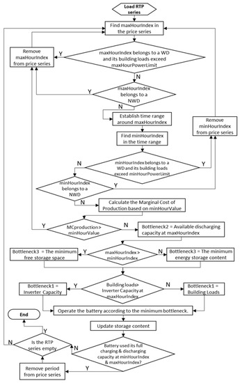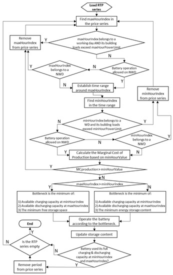 The BSS model operates on an hourly basis and the algorithm takes into account day-ahead real-time electricity prices. It is assumed that the prices of the following day are announced at midnight and that it is possible to perfectly predict the building energy consumption for the following day, in advance. Using all the data mentioned above, the routine takes place 365 times, each covering one day of the year. The principle of the algorithm is to preschedule the charging and discharging operations of the battery; therefore, charging cannot take place without discharging and vice versa.
