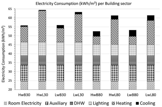 In conclusion, Buildings HwL30 and HwB80 have the highest and lowest electricity consumption values, respectively, and at the same time they provide very good thermal comfort for their occupants. Therefore, as the two extreme cases, they are selected to be further analysed and compared, using several BSS and operational strategies E7, E5 and E0.