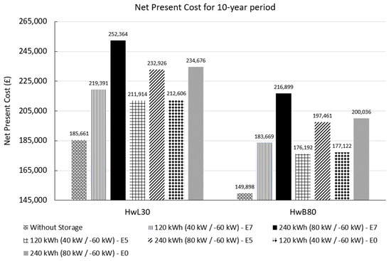 Regarding the long-term economics and the CBA conducted for a 10-year period, Building HwB80 proved to be the most economical, incurring GBP 35,000 less costs under all scenarios, including no storage. The lowest NPCs were observed under the E5 strategy due to the remaining lifetime of the battery (50%) at the end of the 10-year period, and the small amount of revenues. The E0 results are very similar to E5′s, indicating that the E5 operational strategy leads to an insignificant revenue stream from exports. Finally, strategy E7 has the highest NPC values for all scenarios as the export revenues are not sufficient to compensate for the fact that the remaining battery lifespan is non-existent, leading to zero NPC deductions at the end of the study period. When a 20-year period is considered, HwB80 is still the most economical building, incurring GBP 62,000 less in costs under all scenarios, including no storage. Increasing the study period from 10 to 20 years leads to a reduction in the financial motive by GBP 0.02 per kWh shifted, despite the introduction of the additional capital costs needed for the system replacements.