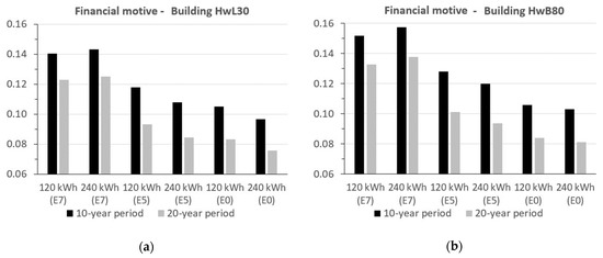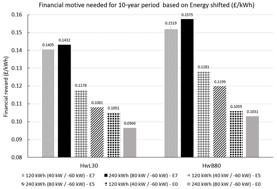 Financial reward needed for a 10-year and 20-year period, based on the electricity shifted (GBP/kWh), for buildings (a) HwL30 and (b) HwB80.