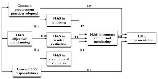 Figure 1 shows the proposed theoretical relationships for considering H&S issues in the procurement process. The model has specified a hypothesised cause and effect relationship that exists among the various indicators and determines the extent of direct and indirect effects that an indicator has on the others, as shown by the arrows. The model has been developed to reflect the chronology in the construction procurement process; it follows the stages including planning (including project objectives), tendering, tender evaluation and contract award, conditions of contract, and contract administration and monitoring, respectively. This is consistent with the stages of construction procurement outlined by Boadu et al. [] and Akintoye and Main [].