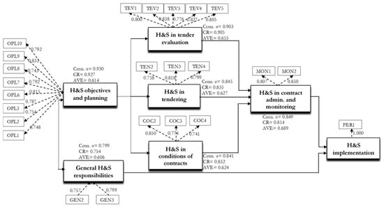 Following the hypothesised model, an empirical analysis was conducted using data collected through a quantitative research approach. This approach is considered appropriate to verify a theory or to determine the truth or otherwise of hypotheses or theories []. The instrument used in this study was developed by considering the extent of H&S integration into decision-making and practices in the various stages of the procurement process. Through reflective measurement models, the various constructs were operationalised. As recommended by Chin et al. [], the latent constructs were operationalised based on three or more indicators, wherever possible.
