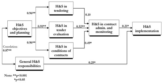 Based on the model in Figure 3, setting clear objectives relating to H&S strongly predicts the extent to which H&S issues will be considered in the tendering process (significant coefficient 0.96). Clearly, this suggests that clients who regard H&S as an important project objective would sufficiently incorporate H&S issues into the tendering process. The tendering stage activities afford clients the opportunity to explicitly specify H&S requirements in the tender documentation. Though the tender process is acknowledged to be complex, challenging, and beset with many uncertainties [], with clearly defined objectives and planning, the required tender documentation and processes could be put in place to achieve the desired H&S outcomes. The need to achieve the project’s H&S objectives would heighten the need for the client to fully consider H&S issues in the tender process. For instance, if a client called for tenders and clearly communicated the way in which prospective tenderers should treat H&S matters in their tenders, then all tendering contractors would be obligated to make appropriate allocations for H&S in their offers, as specified in the tender documentation. This would assist the client to identify and compare the H&S competences of all the contractors and accordingly, eliminate unscrupulous ones [].