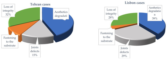 From the preliminary analyses of the data collected, as shown in Figure 3, the most and least frequent defects detected during the fieldwork in both research areas are aesthetic anomalies and those related to the fastening to the substrate, respectively. In the Tehran dataset, the aesthetic anomalies are followed by defects related to the loss of integrity (32%) and, finally, joint defects (15%). On the contrary, the analysis of the Lisbon cases shows joint defects in 29% of the inspected façades, while the defects associated with the loss of integrity occur in 28% of the case studies analysed.