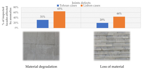 Concerning the defects related to the joints, as shown in Figure 5, degradation of the materials used to fill the joints is more frequent than the loss of material (which corresponds to a more serious defect with severe consequences, such as penetration of water in the substrate). Concomitantly, given the higher age of the samples under analysis in Lisbon (less than 89 years) than in Tehran (less than 48 years), the first sample was naturally subjected for a longer period to the degradation mechanisms, thus leading to a higher incidence of joint defects.
