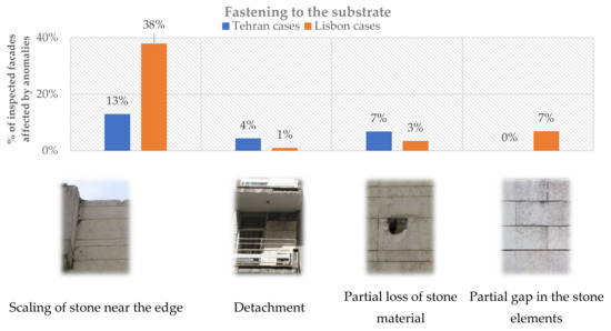 Concerning the defects related to the fastening to the substrate (Figure 6), the scaling of the stone near the edges is the major defect in the sample analysed. This is followed by a partial loss of stone material and detachment, respectively, while a partial gap in the stone elements does not occur in any inspected cases in Tehran. Conversely, the analysis of the Lisbon data reveals that the presence of partial gaps in the stone elements is the second most common defect, followed by a partial loss of stone material.