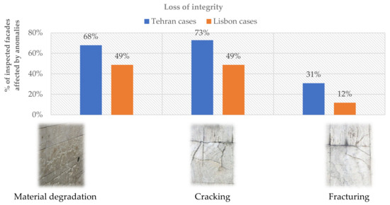 Notwithstanding the lower age of the studied samples in Tehran (with an average age of 26 years and a maximum age of 48 years) in comparison with those in Lisbon (with an average age of 38 years and a maximum age of 89 years), the defects related to the loss of integrity are more frequent in Tehran than in Lisbon, as presented in Figure 7. This result can be justified by the presence of high levels of pollutants in Tehran, which occasionally reach dangerous levels, jeopardising the health of its residents and their quality of life [36,37]. Higher air pollution increases the deterioration and weathering of stone materials [38], causing different types of anomalies related to the loss of integrity of stone plates (e.g., erosion). Moreover, the action of pollutants also promotes discoloration of the stone elements [39], as observed in 46% of the Tehran sample, and a higher deposition of sediments (Figure 4).