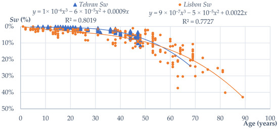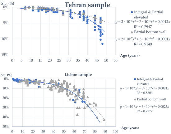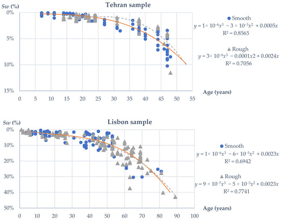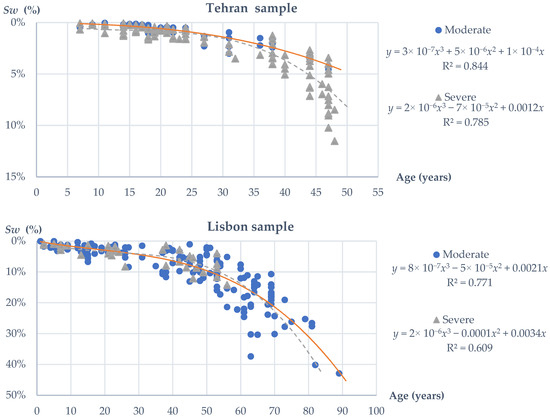 To evaluate the degradation of stone claddings over time, four typical deterioration patterns were proposed by Shohet et al. [20], defined based on specific degradation agents and mechanisms, comprising linear, convex-shaped, concave-shaped and S-shaped patterns. In this study, an S-shaped pattern was used, which allows taking into account different rates of the degradation of stone claddings; i.e., it is capable of describing the process of the cladding’s deterioration, which starts slowly and apparently stabilises over time but accelerates again near the end of the cladding’s service life. Accordingly, “S”-shaped degradation curves are obtained through a nonlinear regression, where a third-degree polynomial line is fitted to the case studies analysed in the fieldwork (Figure 8). The degradation curves of the Tehran and Lisbon data sets lead to a determination coefficient (R2) of 0.80 and 0.77, respectively. This reveals that a high percentage of the variance of the variable “severity” can be described by the proposed curves, i.e., there is a good correlation between the observed values and those predicted by the model.