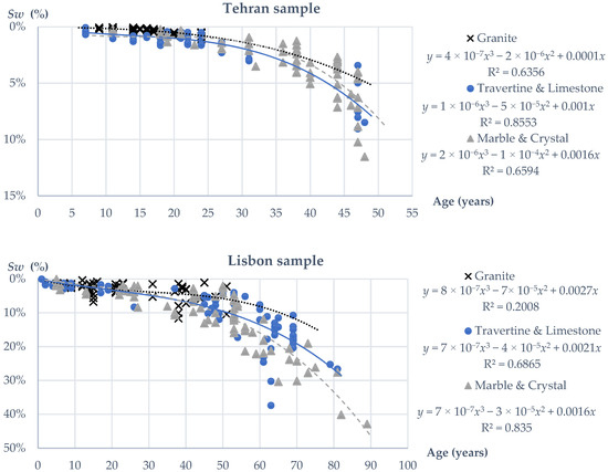 In both research areas, granite stones present a longer estimated service life, even though the Lisbon data show a curve that is statistically unreliable due to a high scatter of results. In second and third place, the degradation curves reveal that travertine and limestone are more durable than marble and crystal in exterior wall claddings. An estimated service life of 64 and 63 years was obtained for limestone and marble, respectively, in Tehran, while 78 and 66 years were the estimated service lives obtained for limestone and marble, respectively, in Lisbon. These results are consistent with those of Schouenborg et al. [45], who found that granite is the most durable cladding stone, followed by limestone and then marble, by analysing the strength capacity of stone plates of 200 buildings.