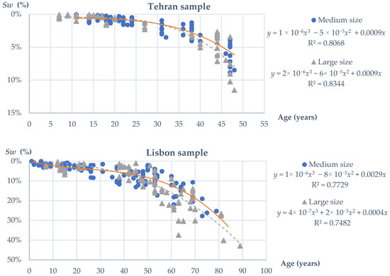 Regarding the evolution of the degradation condition of stone claddings according to the size of the stone elements (Figure 12), the results reveal that claddings with medium size plates (area < 0.4 m2) present longer estimated service lives than those with larger stone plates (area ≥ 0.4 m2). As mentioned by Silva et al. [2], this can probably be explained by the fact that the larger the size of the stone elements, the greater the cladding’s susceptibility to weather effects, in addition to the lower relative area of the joints in the larger plates and a resulting higher concentration of stresses, which can promote a higher incidence of defects. Based on the degradation curves (Figure 11), an estimated service life of 67 and 61 years was obtained for the Tehran claddings with medium and large stone plates, respectively, and 71 and 66 years for the Lisbon sample.